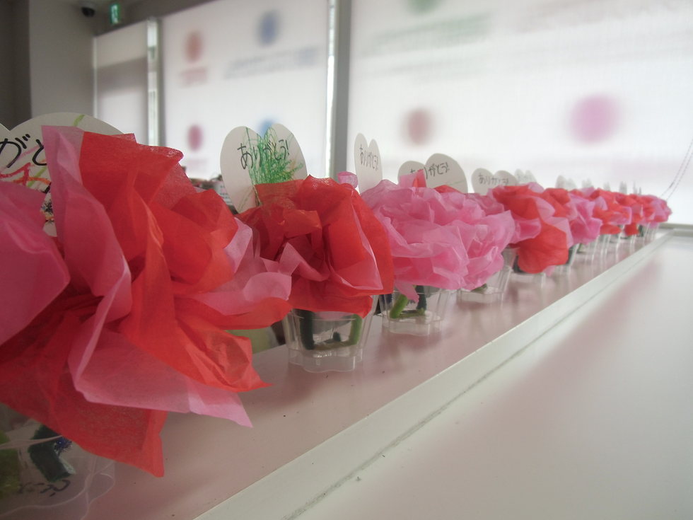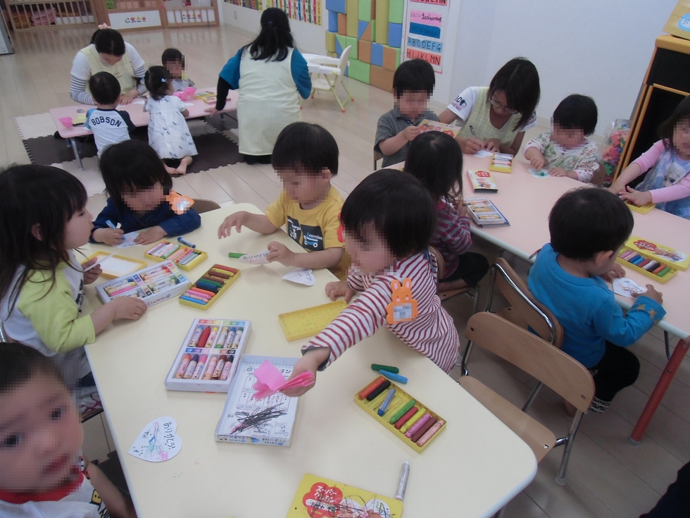 メッセージカードにお母さんのお顔を描いたり、色を塗ったり、模様をつけたり、子天使ちゃん達真剣です。(右下写真)