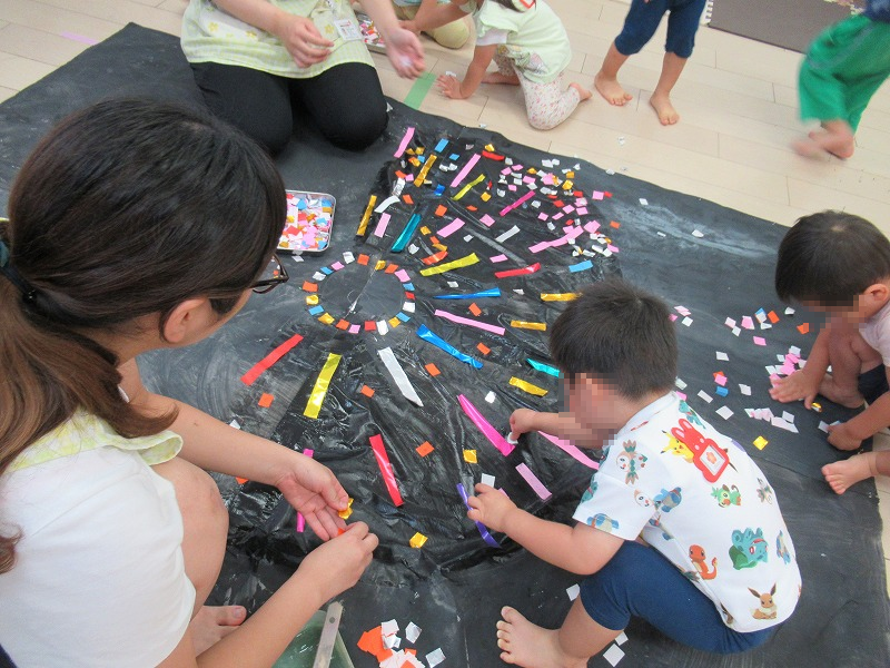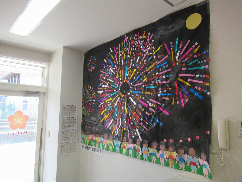 夏祭りのメイン展示物・園児合同制作は「ウェリナの大花火」下地の色塗りから切ったり貼ったり、園児たち凄い集中力でがんばりました!