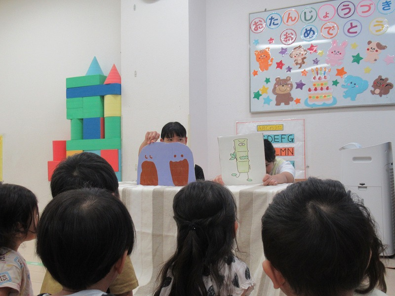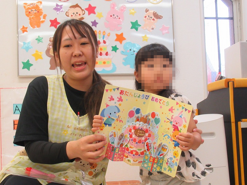 恒例の先生達による出しものを楽しんだら、先生からバースデーカードを受け取って、みんなでお歌のプレゼント。給食師さんの手作りケーキに牛乳でカンパーイ!
