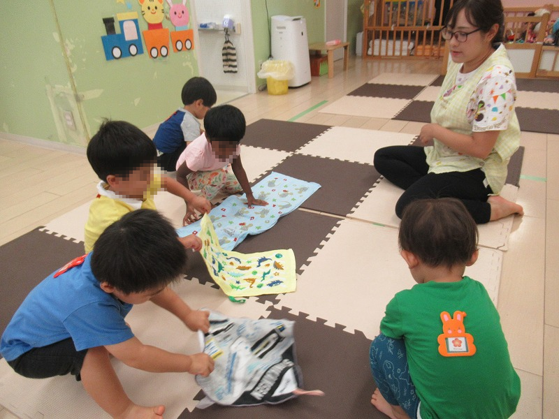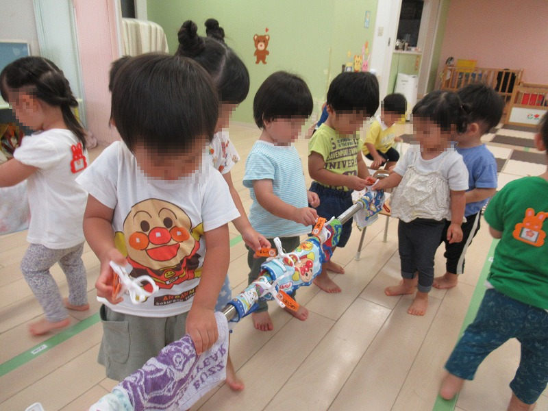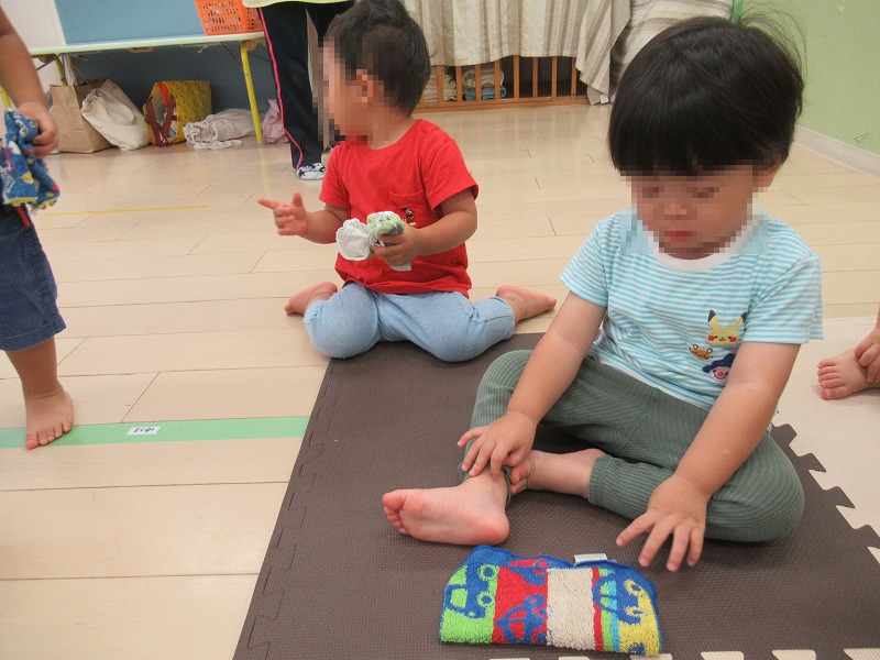 洗濯ごっこ→自分で洗って干して乾いたタオルだと一生懸命にキレイにたたもうとするんですよ。凄い集中力なんです(^-^)/