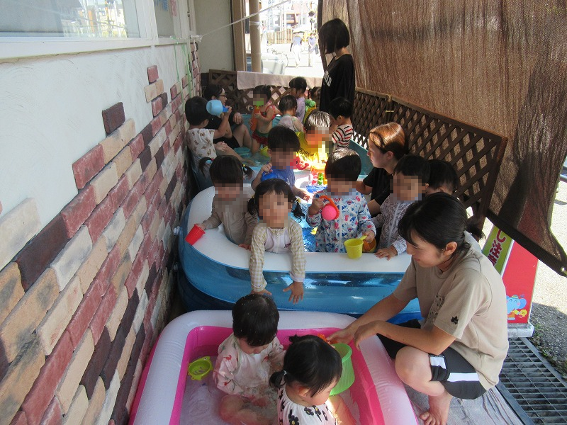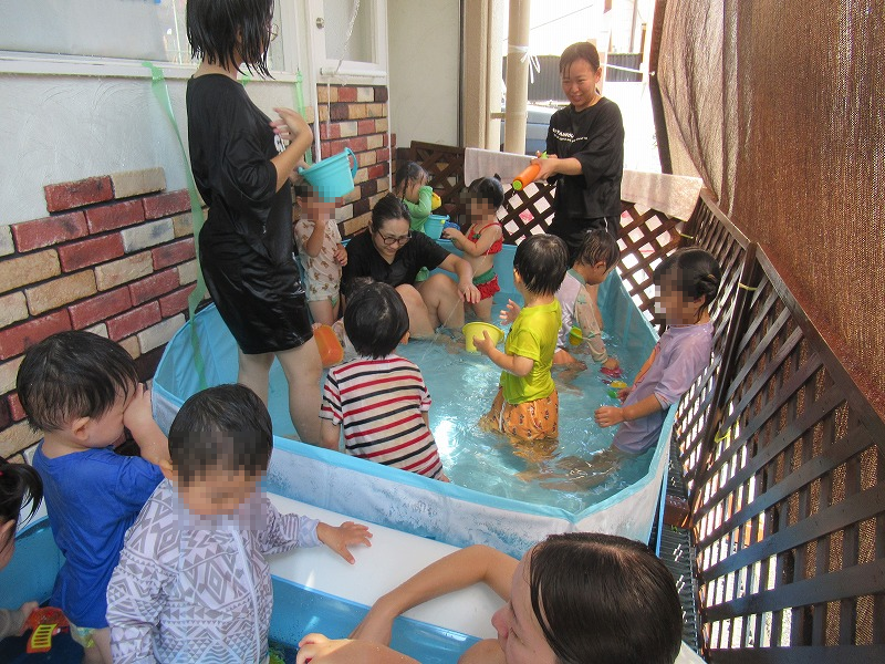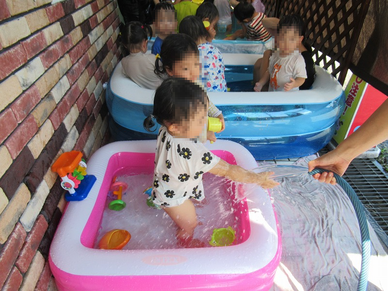 プールの初日は水が怖くて泣いていた子天使ちゃんも、今ではすっかり水に慣れて楽しそうに水遊び♪水がお顔にかかったり、お顔が水につかったりしたら息を止めることもちゃんと覚えたみたい(^-^)