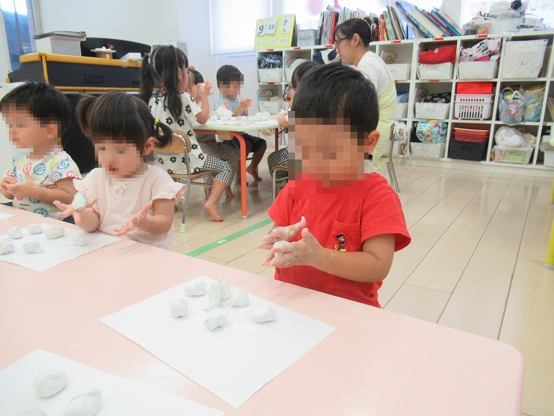 今年の(十五夜お月さん)は9月の17日。この日はお月見のお供え飾りを作りました。先生から絵本を使ってのお月見の話を聞いたら、工作の開始です(^-^)