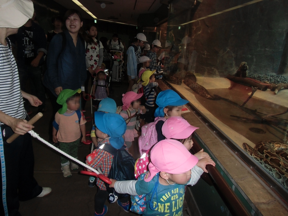 爬虫類館では大きなにしきヘビ。(右下写真)「うげ〜っ」「気持ちわる〜い」「□※△○・・・」(笑)