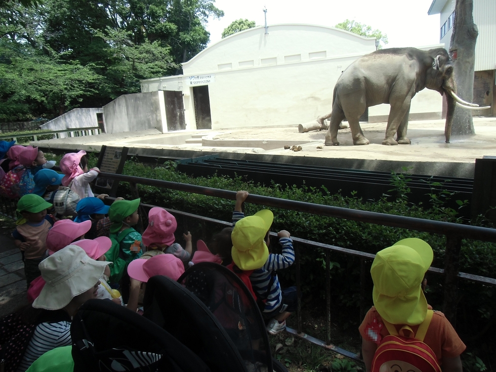 写真はみんな大好きゾウさんです。「大きいぃ〜」「うわ〜っ!」「○△※□〜!」言葉にならない叫びをあげて大興奮(^0^)。