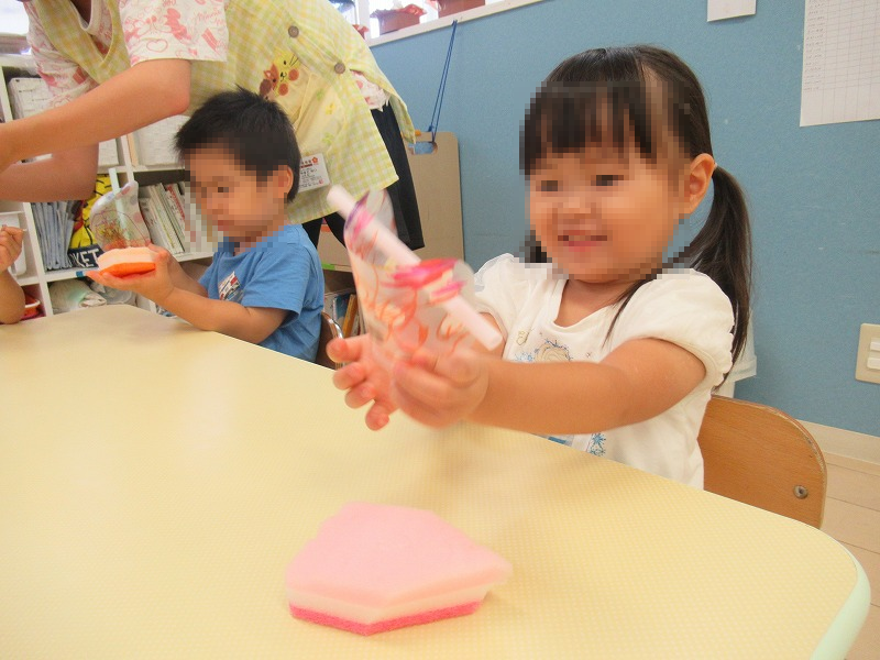 今週はスポンジお舟を作りました帆に描きかき♪スポンジに穴をあけて帆に差し込みます♪