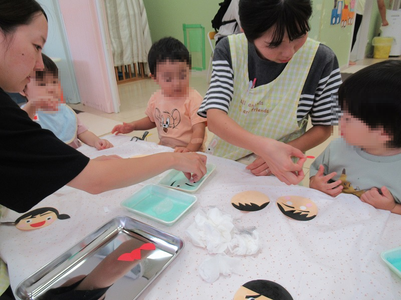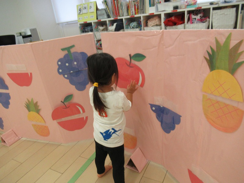 みんな〜よく頑張りました!写真は今週の工作、果物の合わせ絵、梨の皮むき見学♪