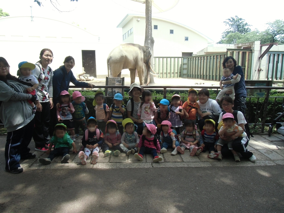 お腹がふくれたらゾウさんと一緒に集合写真です。