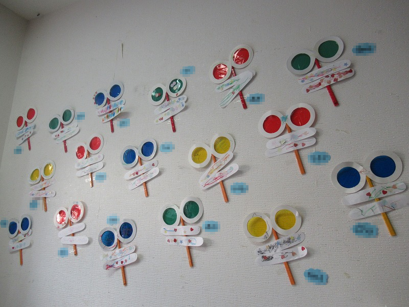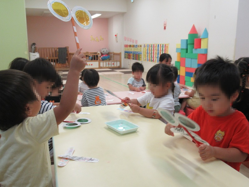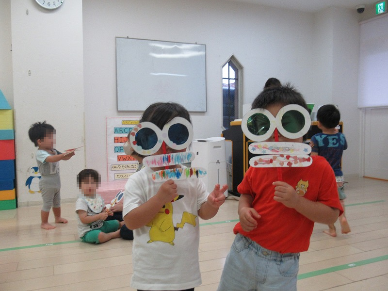 集中力を発揮して作ったメガネ。自分たちで作ったオモチャで遊ぶのって面白いよねー(^-^)