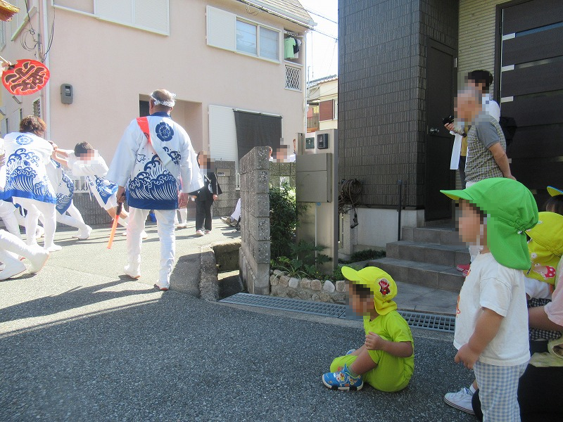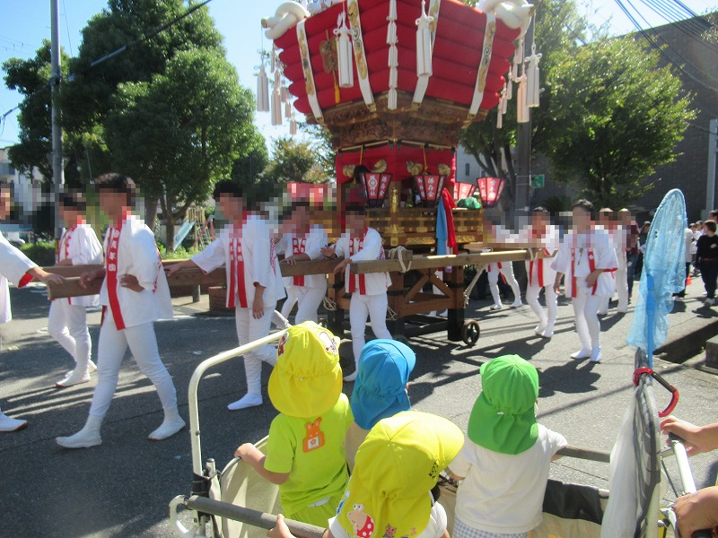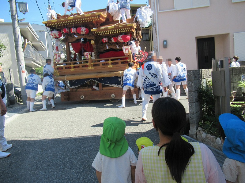 今日は塚口神社秋祭り山車巡行の日。土曜日なので登園している子は少ないんですが、もちろん見に行ってきました(^-^)。