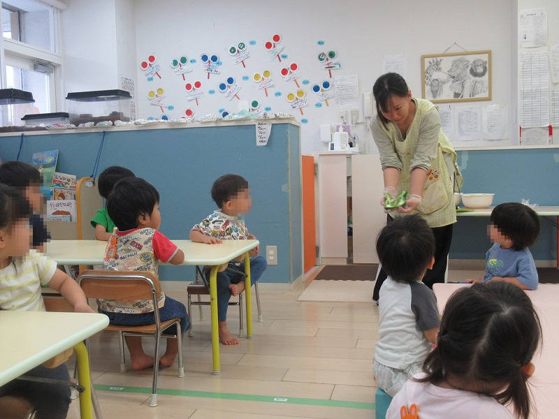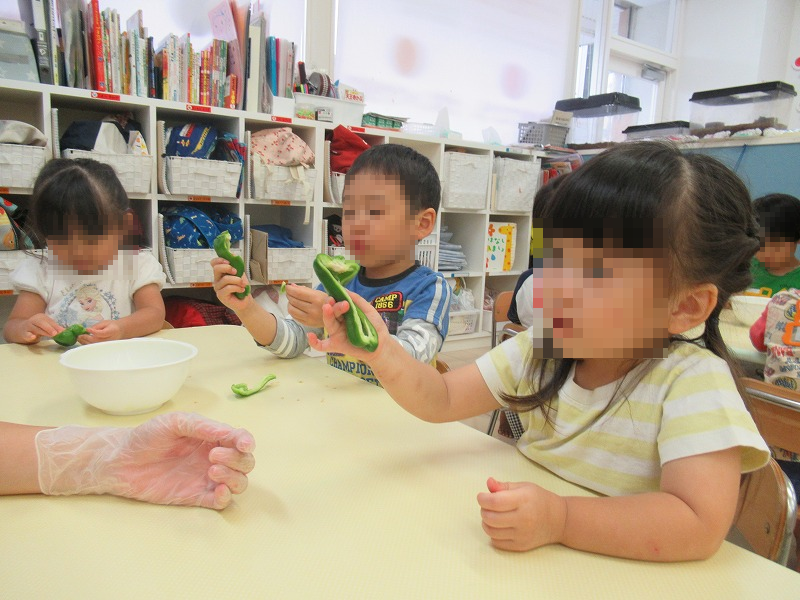 この日の食育はピーマンの種取りをしました先生から説明を受けたら、種取り開始(^-^)丁寧に種を取っていきます