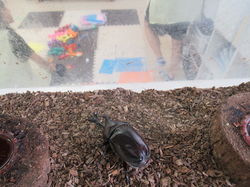 下の写真(左)は寝ている?カブト虫(死んでいるのではないんです)。つんつんと突っくとムクッと起き上がって(下右の写真)、元気に歩き餌を食べたりしています。実はこんな状態がもう1週間も続いているんですよ(ビックリ!)。