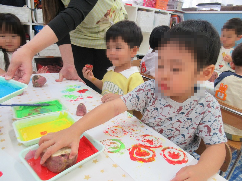 先週の芋ほり遠足で収穫した芋を使って芋版画(^-^)