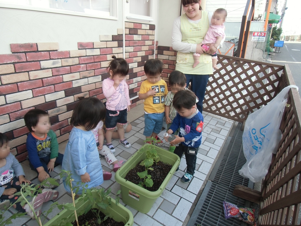 左下写真は設定保育での食育。トマトとキュウリを育てています。