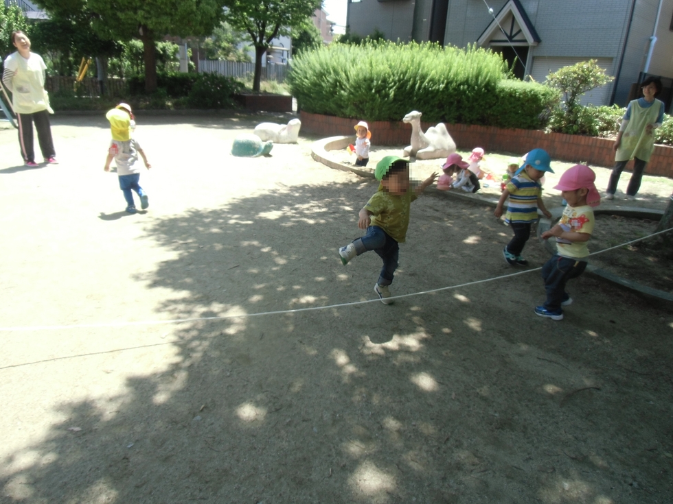 お外遊びでは2才児男子が縄跳びに挑戦です。(右下写真)