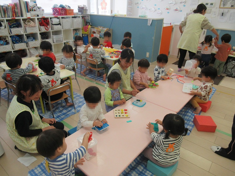 たくさん遊んで自然に学ぶことができました。写真はモンテッソーリ玩具に取り組む子ども達、みんな凄い集中力です(^-^)