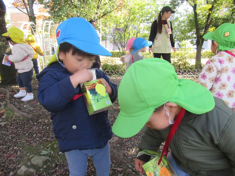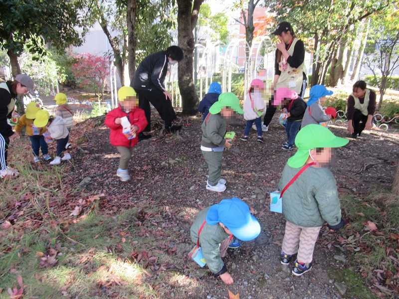 工作の時間に作った(どんぐり回収カバン)を肩からかけて、せっせとどんぐりを集める子ども達、すごい集中力です(^-^)