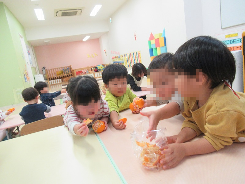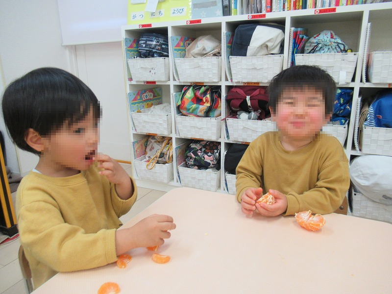初めてのみかんの皮むき、自分で出来ることが嬉しいみたいで、皮をむいているだけなのに楽しそう(笑)