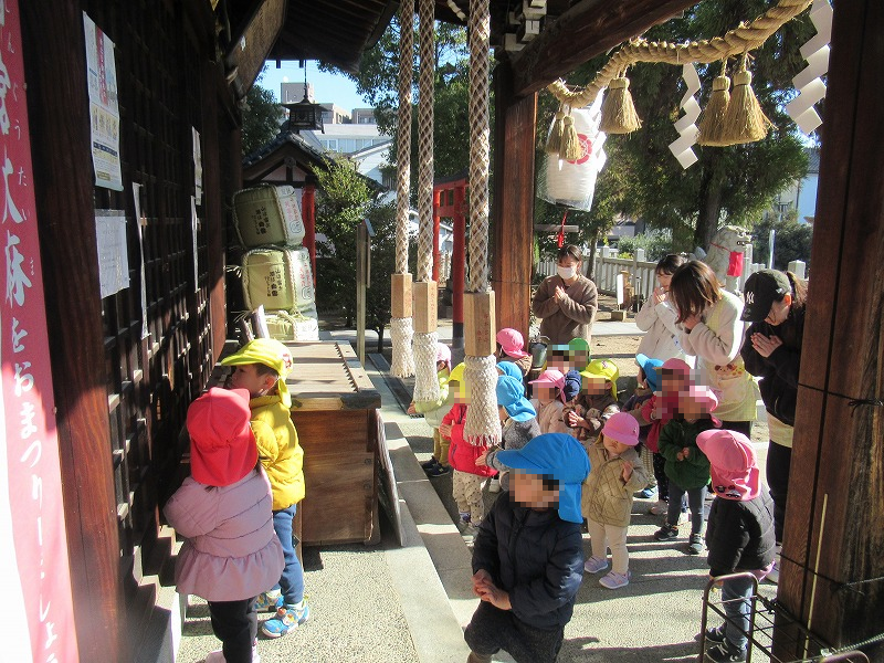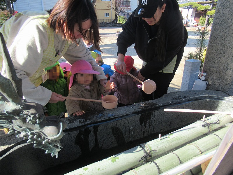 今週月曜日は園の氏神様、塚口神社に園として初詣に行ってきました(^-^)手水舎で身を清めたら神様にご挨拶。「いつもありがとうございます!」「今年もよろしくお願いします!」(^-^)/