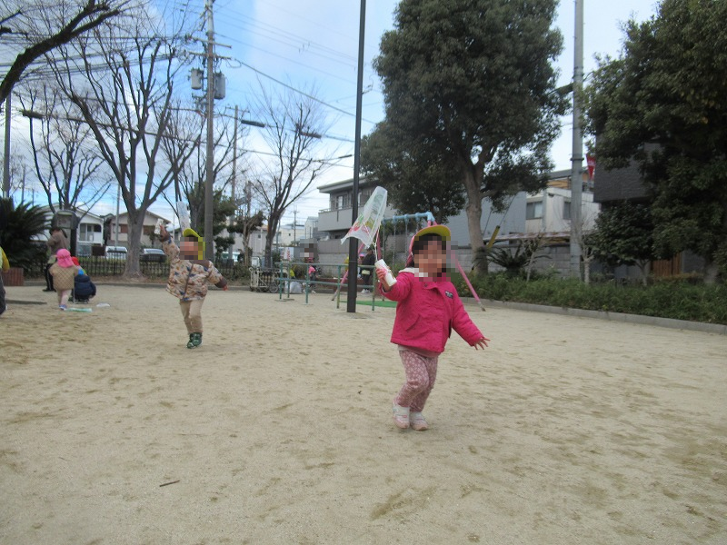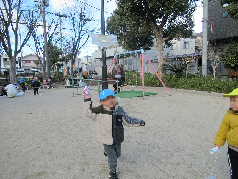 この日は今週の工作の時間に作った凧をあげて遊びました。この凧が結構ちゃんとあがるんです(^-^)