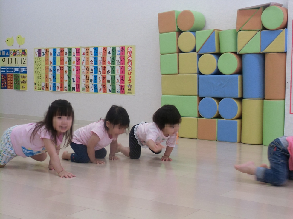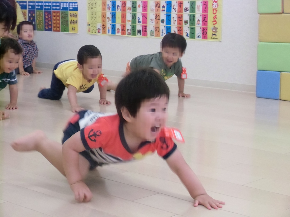 写真は先週の体育の時間のハイハイ競争。これが結構大変なんです。全身運動ですから。でも、子天使ちゃん達ノリノリですごく楽しそう!