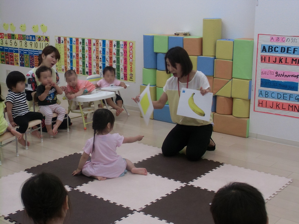 写真は子天使ちゃん達が大好きなECC幼児英会話の先生(^-^)。「Yellow」と同じ色した食べ物は?「Banana」(^o^) 正解!