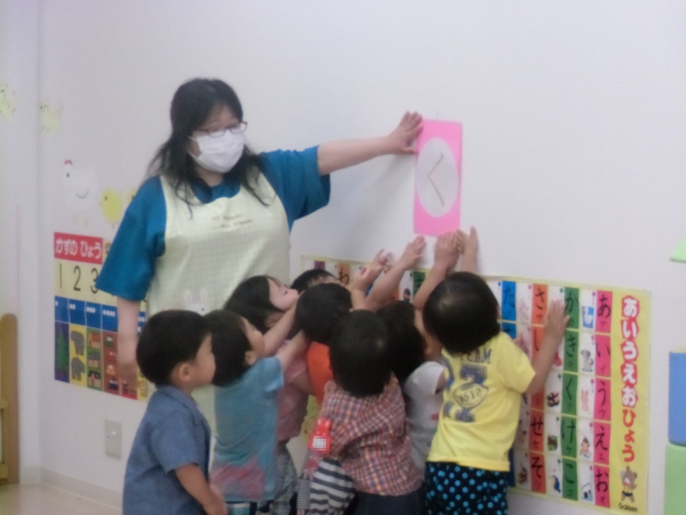 文字遊びは「文字探し」をしました(^-^)。(左下写真)『く』はどこ?「ここ〜っ!」「あったぁ〜!」「○×□※△〜」(^o^)人気のプログラムです。