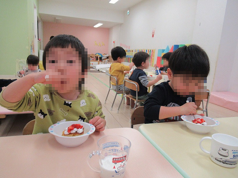 恒例の先生たちの出し物を楽しんだら、手作りケーキ、牛乳でカンパーイ!