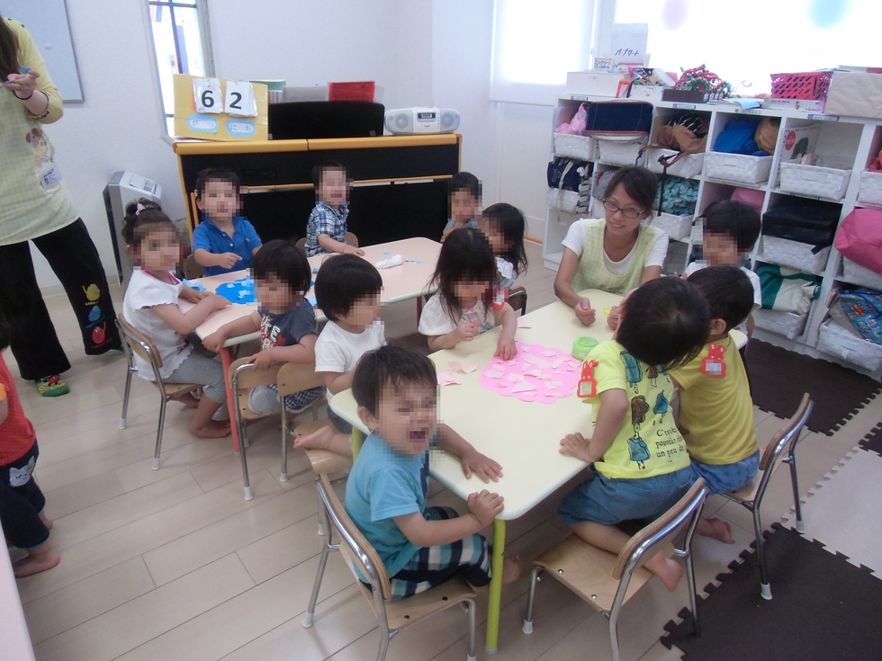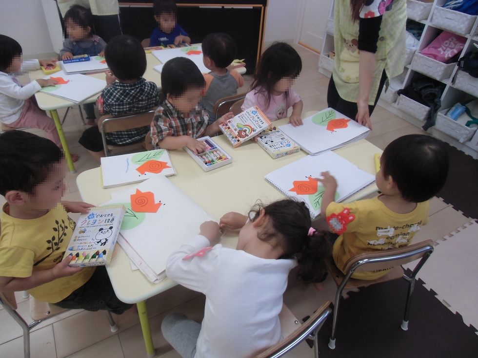 工作やお絵かき、貼り絵等も子天使ちゃん達に人気の設定保育です。(右左下写真)。カキカキ、ぺタぺタ、ハリハリ(^-^)。楽しいね。