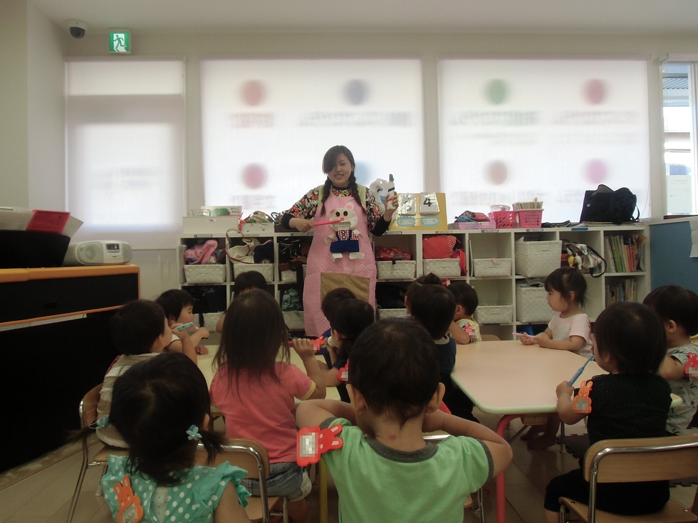 6/4は虫歯予防ディ。エプロンシアターを使って歯の健康についてのお話です。子天使ちゃん達も歯ブラシを持ってウサギちゃんと一緒にゴシゴシ(^-^)。(写真)