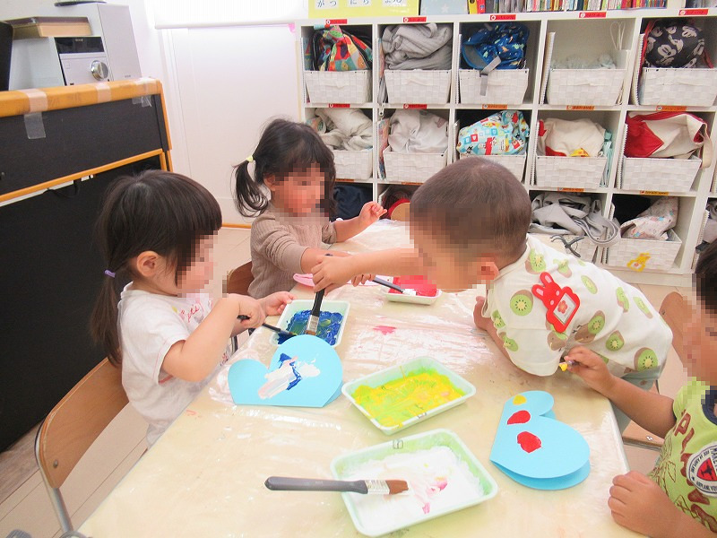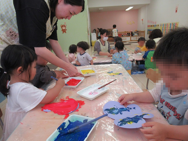 「デカルコマニー」をしました(^-^)デカルコマニーとたいそうに言いますが(笑)、日本の幼児教育でお馴染みの「合わせ絵(移し絵)」と同じなんですね。モンテッソーリは「お箸遊び」「型はめ」「スプーン運び」「糸通し」などなど日本に昔からある遊びと同じなんですよ。開園当初から当園が注力している非認知的能力にいたっては日本の諺にある「三つ子の魂百まで」のことだと感じています。
