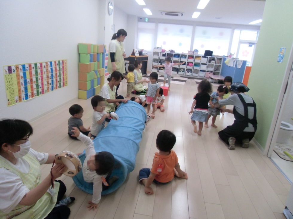最後は子天使ちゃん達に人気の「平均台+トンネルくぐり」。(右下写真)順番待ちも上手にできましたね(^-^)。
