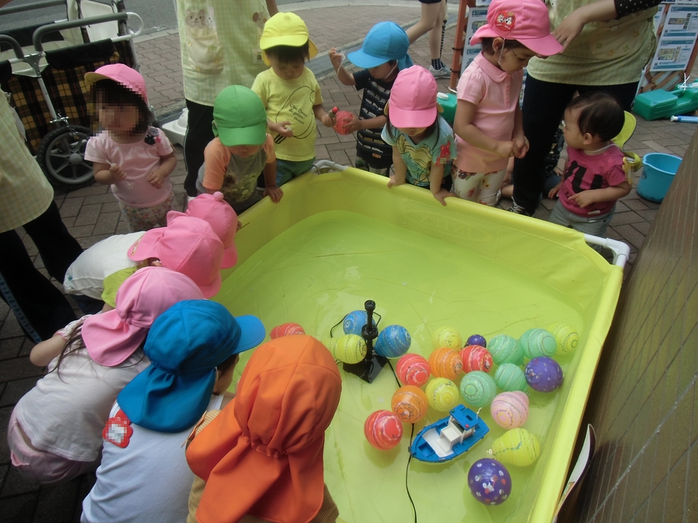 写真は駅前の不動産屋さんの店頭でヨーヨー釣りをさせてもらっている子天使ちゃん達(^-^)。
