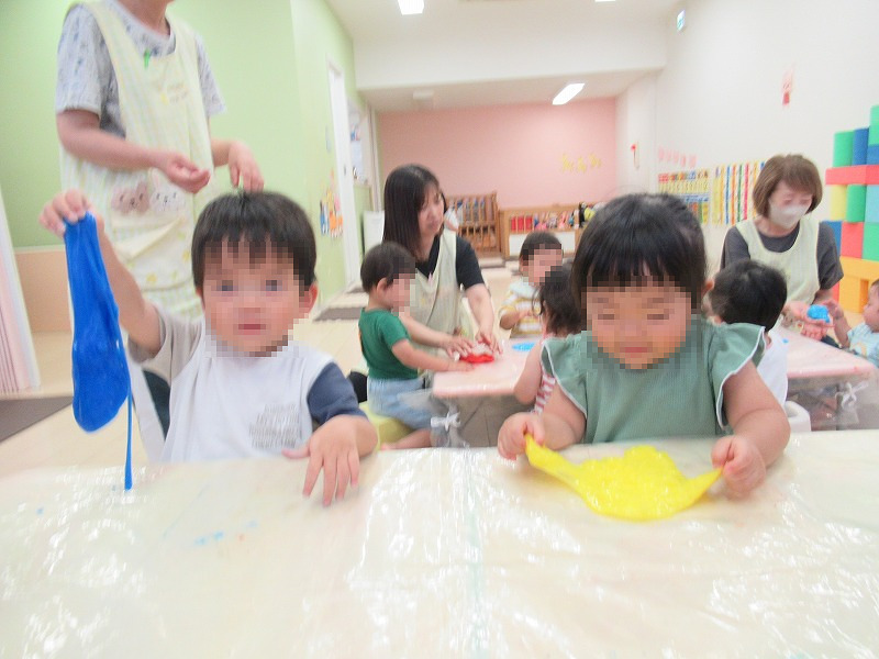 出来上がったスライムで嬉しそうに遊ぶ子ども達(^-^)なかには不思議そうな表情でスライムをじっと見つめ続けている子も(笑)
