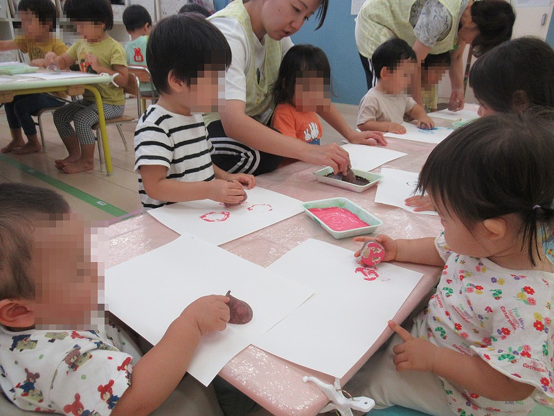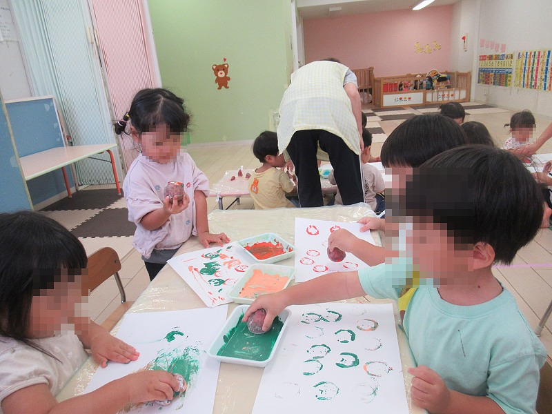 下の写真は今週の工作の時間、芋版画を楽しむ子ども達(^-^)