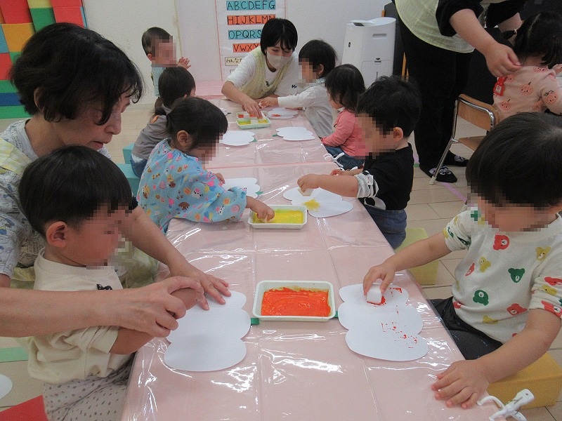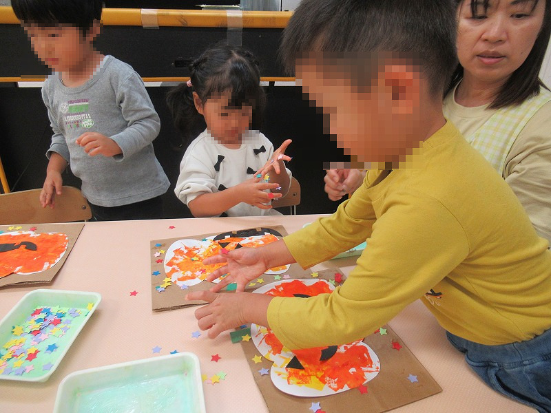 たくさんお菓子を回収すべく、子ども達は真剣な表情でお菓子回収バックを作っています(笑)みんながんばれー!