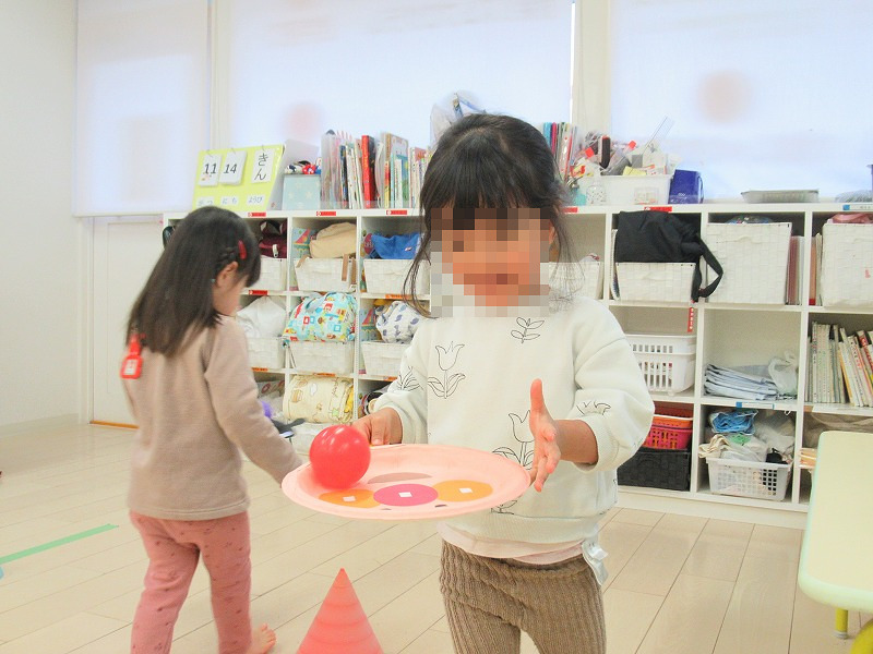 頭にタオルを乗せて落とさないようにソローリ・ソローリ。