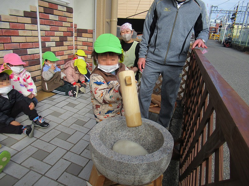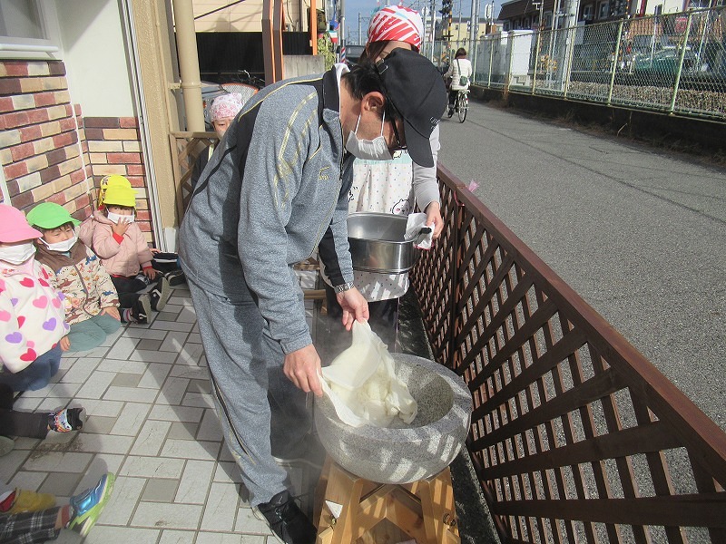 前日に皆でといだもち米を、調理師さんが朝から蒸して〜