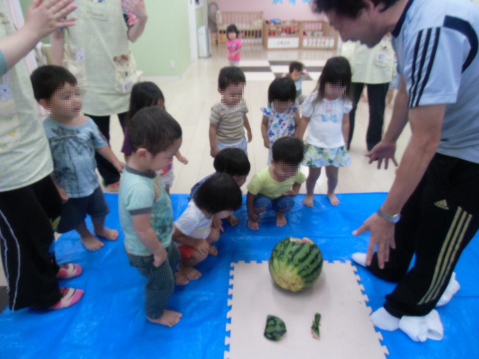 やっと割れたスイカをコワゴワと覗き込む子天使ちゃん達。(左下写真)(なぜにコワゴワ?笑)