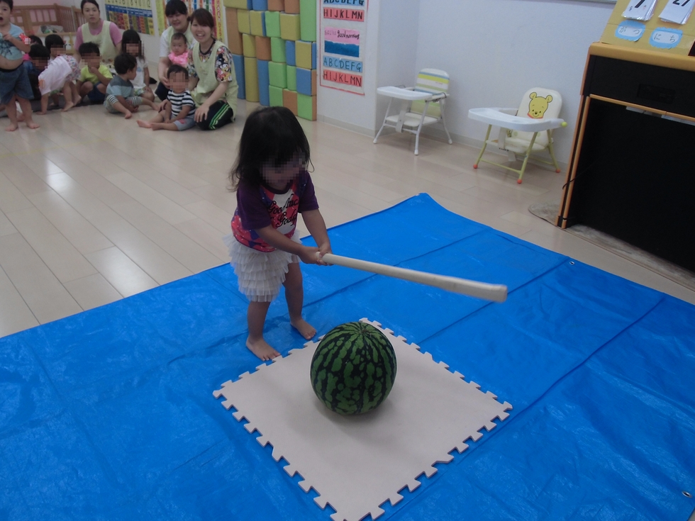 子天使ちゃん達は目隠し無しのスイカ割りです(笑)。(写真)子天使ちゃん達の力ではなかなかスイカが割れません。「ウェリナ子天使軍団 VS スイカ」の始まりです(^o^)。