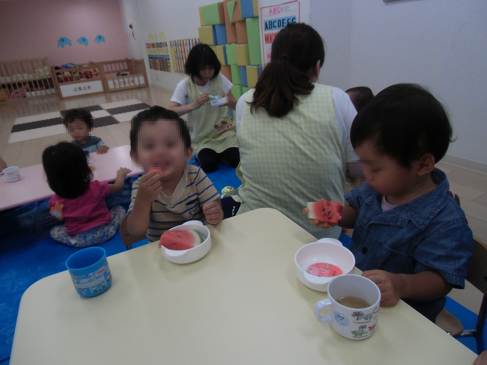 おやつはもちろんスイカです。(右下写真)「おいしいね〜」(^-^)。