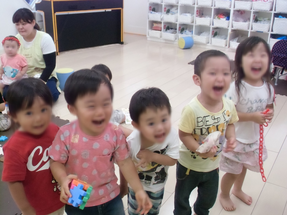 写真は自由保育時間の2才児子天使ちゃん達(^-^)。ふざけ合っているところにカメラを向けたら、なぜか整列状態に(笑)。