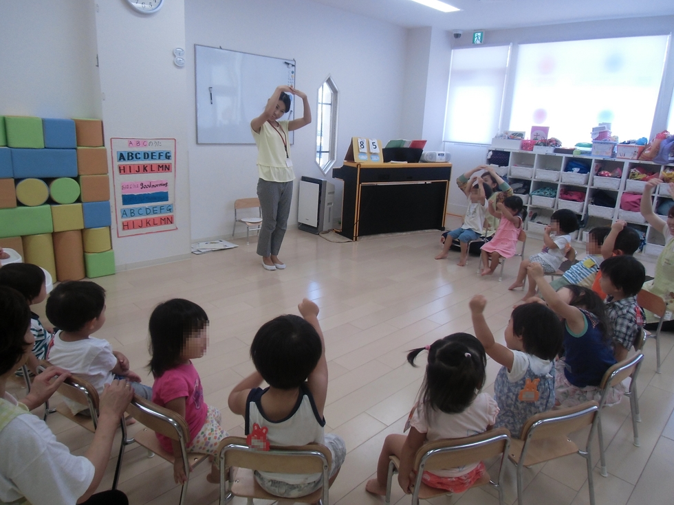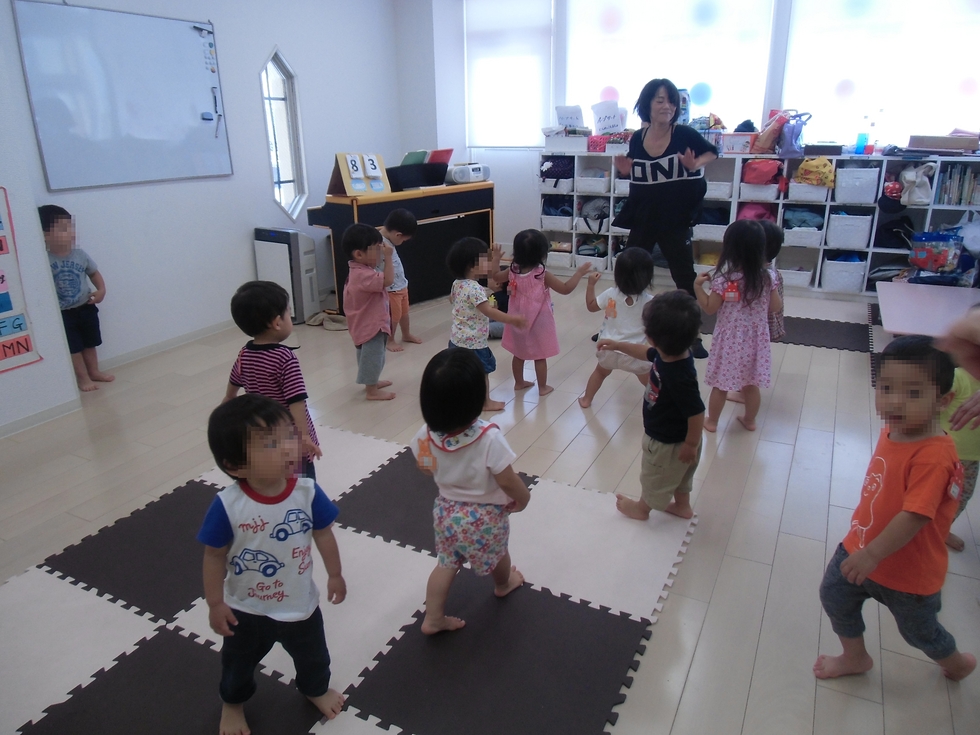 左下写真は毎週月曜のダンスプログラム。右下写真は毎週水曜の英会話プログラム。子天使ちゃん達はダンスの先生も英会話の先生も大好きなんです(^o^)。そう、園長がやきもちを焼くぐらいに(笑)。