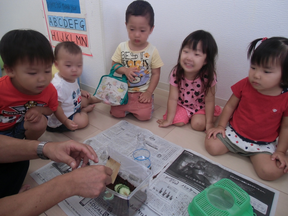 はじめは嫌がっていた子天使ちゃん達も、今では鈴虫のお世話を始めると集まってきて一緒にお世話してくれるんですよ(^0^)。