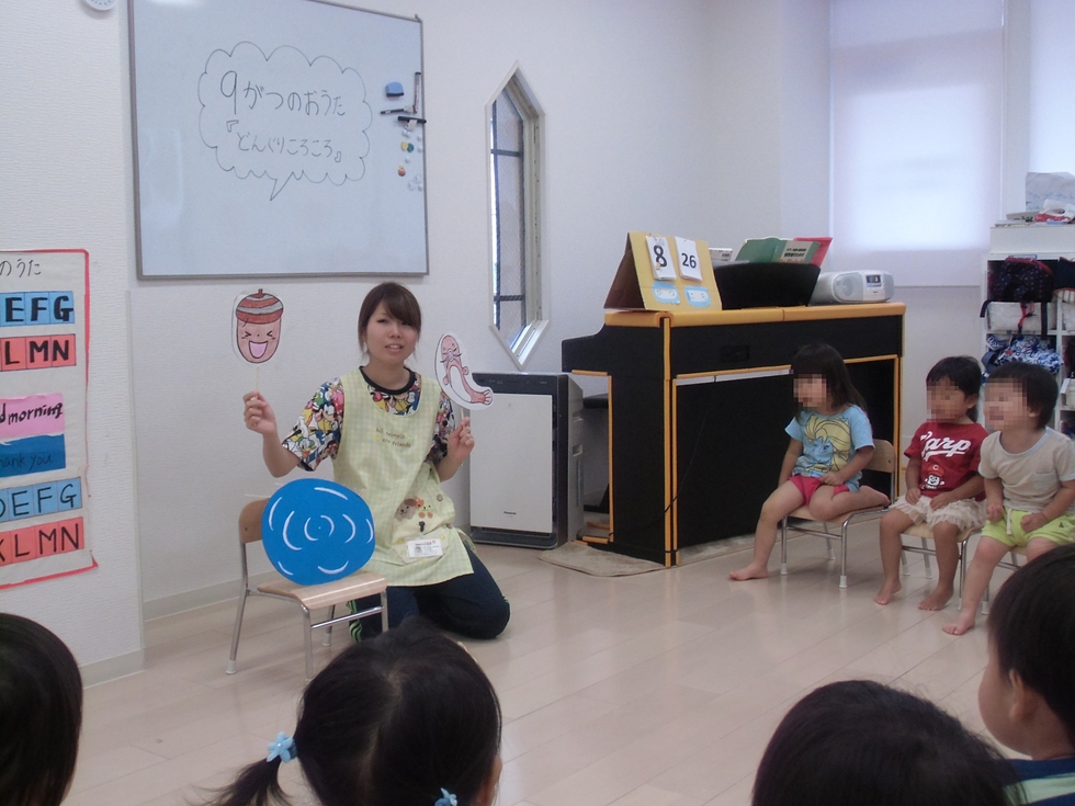 9月の朝のお歌は「どんぐりころころ」、〈どんぐり〉と〈お池〉と〈どじょう〉のペープサートを使ってお歌の内容をお話します(^-^)。(写真)