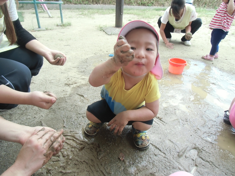 泥でお団子を作ったり、水たまりを利用して地面に水路を作ったりと楽しそう〜!左下写真の子天使ちゃん、アゴにまで泥が付いちゃってます(笑)。