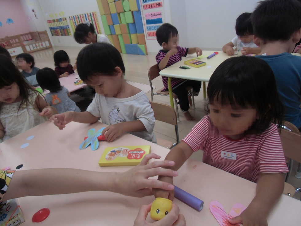 トンボの羽を糊で体にくっつけます。指で糊をヌリヌリ〜ヌリヌリ〜(^-^)。(スティク糊は使いません)子天使ちゃん達、糊を使うのが上手くなってきました。(写真)