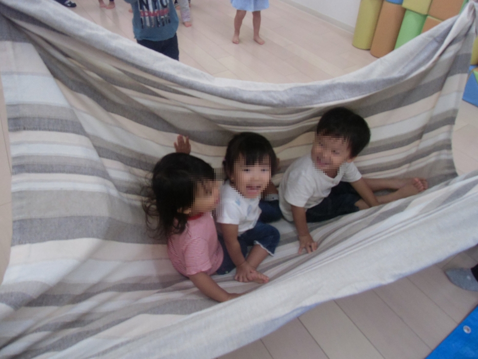 ジャレつき遊びは子天使ちゃん達の大好きなハンモック遊び「魔法のじゅうたん」です。う〜ん、いい笑顔(^o^)。(右下写真)