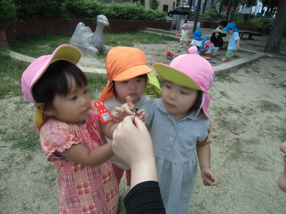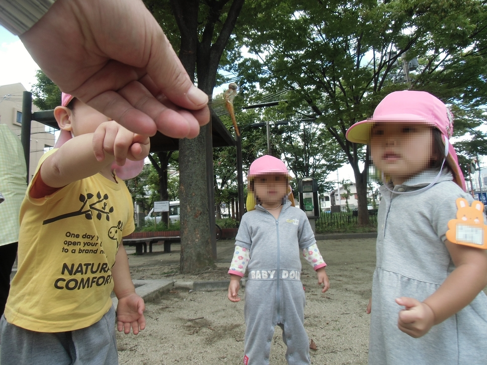 捕まえた最初の一匹、園長がとんぼを持って近づいていくと、じりじりと後ずさりする子天使ちゃん達。「ほれっ」もっと近づけると「こわーいっ!」「ぎゃ〜っ」「いやぁぁ〜」「○△※□〜!」・・いっせいに逃げ出す子天使ちゃん達(^-^)。