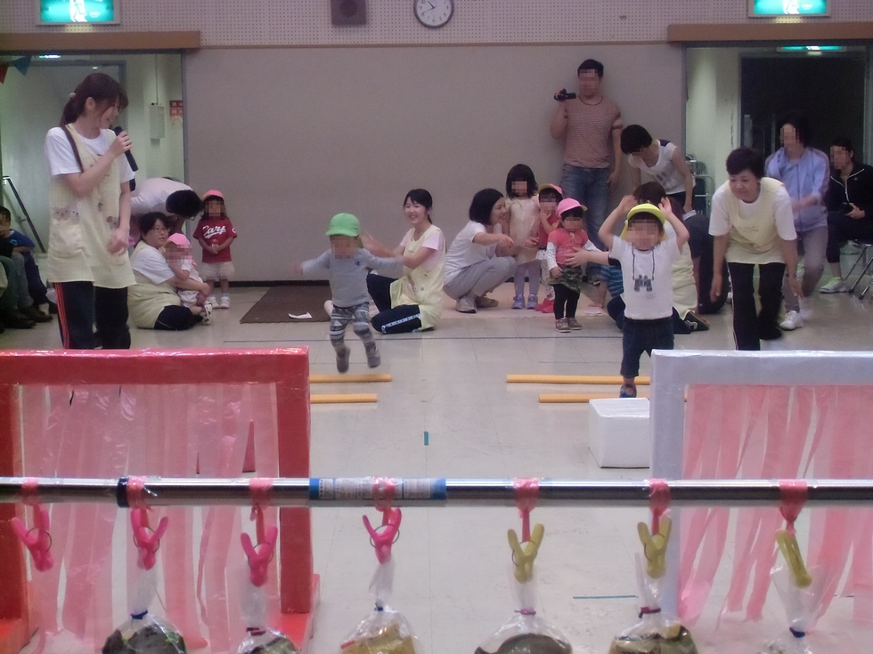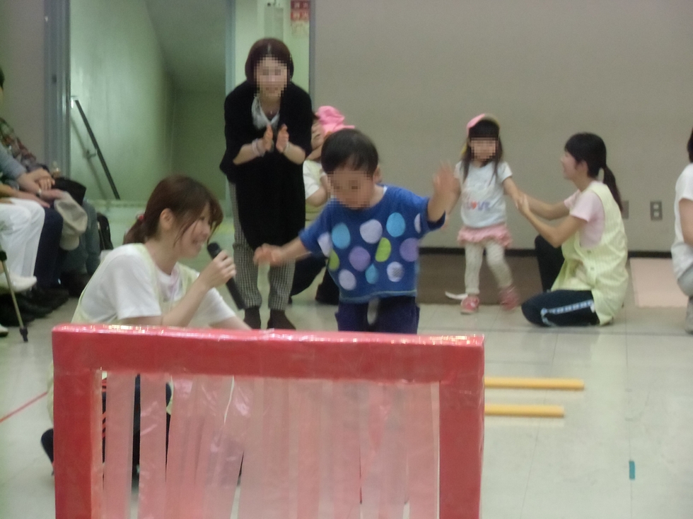 棒を飛び越え、平均台を渡り、トンネルをくぐり〜みごとお菓子をゲットできますか(^-^)。