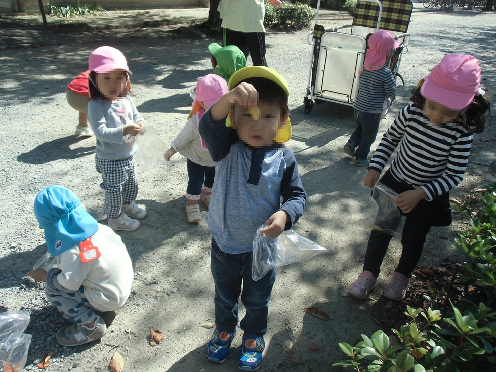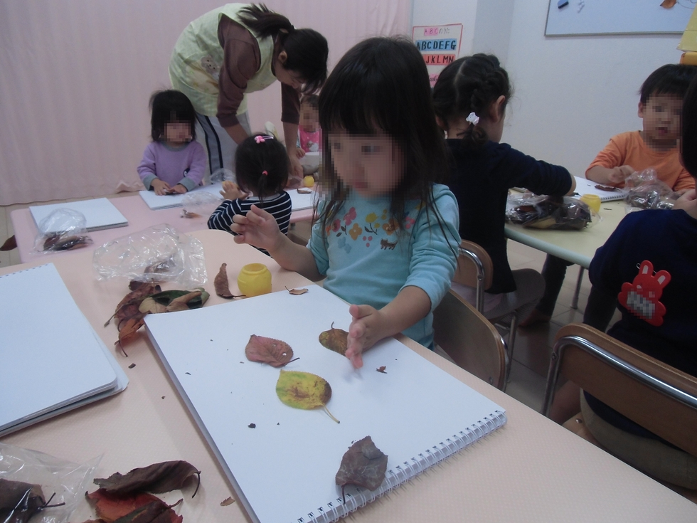 塚口神社に落ち葉拾いに行って、拾った落ち葉で工作です。